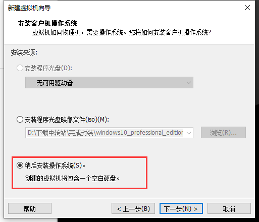 - 选择”稍后安装操作系统”, 然后”下一步”,