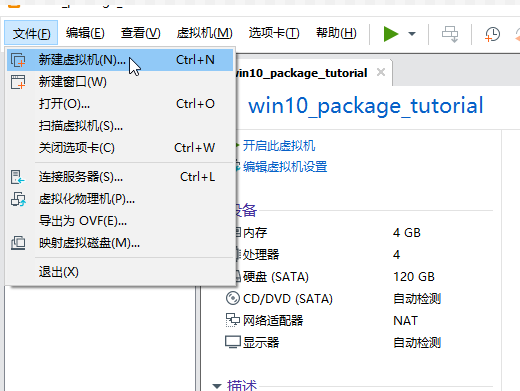 - 在vmware中创建新的虚拟机: 左上角的文件 – 新建虚拟机