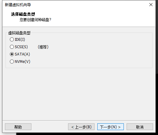 - 虚拟磁盘类型我们选择”SATA”, 接着”下一步”,