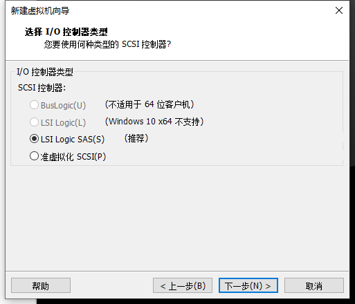 - I/O控制器类型保持默认的”LSI logic SAS”就可以, 继续”下一步”,