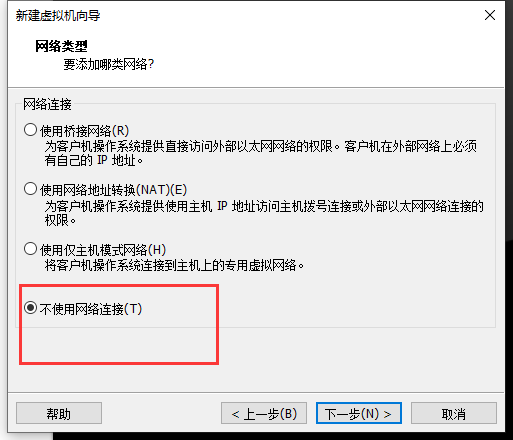- 网络类型我们选择”不使用网络连接”, 接着”下一步”,