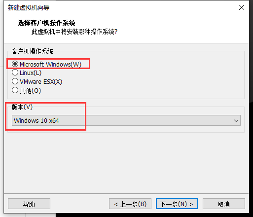 - 客户机操作系统选择”Microsoft Windows”, 版本选择”Windows 10 x64”, 然后”下一步”