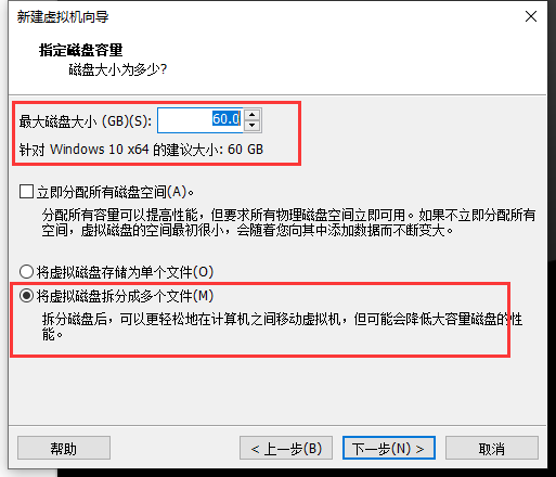 - 磁盘大小根据自己大概需要封装多少常用软件进去去设置, 十分不建议设置过大然后封装过多的软件进系统, 不仅导致封装出的ISO镜像过大, 还会让系统的安装变得很慢, 出现错误的几率也会增大 ,然后保持下面默认的的”将虚拟磁盘存储为多个文件”, 继续”下一步”