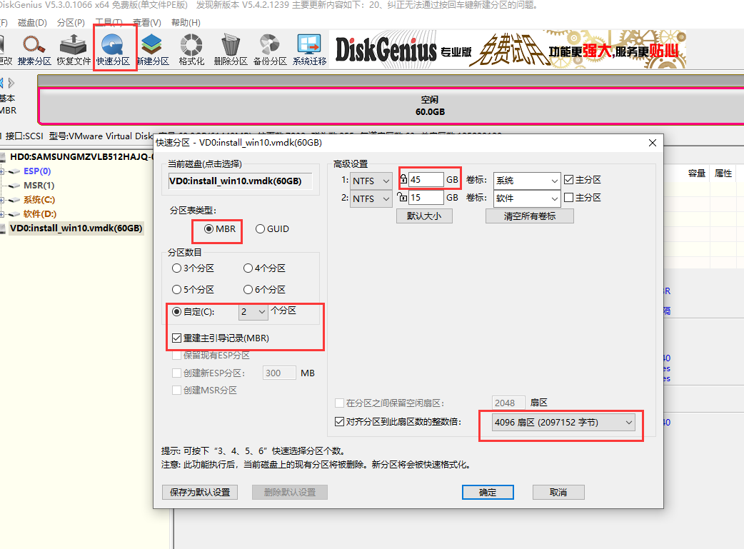 - 选中图中虚拟机磁盘, 然后点击上面的”快速分区”, 配置如图