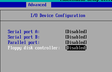 - 将”Serail port A”、”Serail port B”、”Parallet port”、”Floppy disk controller”四项全部设置为”Disabled”