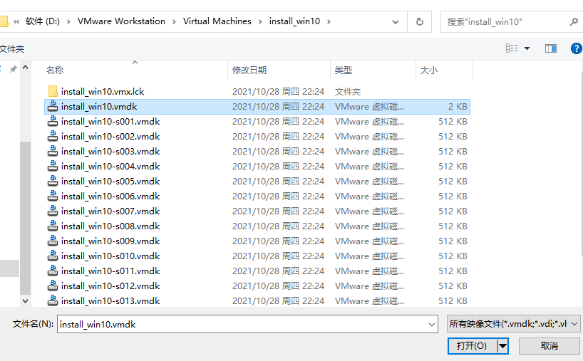 - 找到我们虚拟机存放的位置, 然后选择.vmdk的文件, 然后点击”打开”