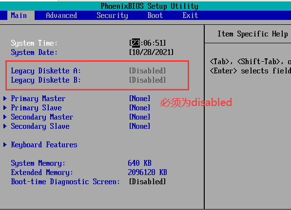 - 进入BIOS后, 设置”Legacy Diskette A” 与 “Legacy Diskette B”为disabled