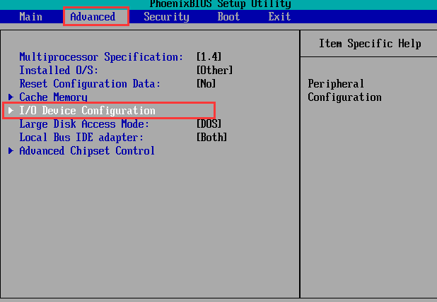 - 切换至”Advanced”菜单, 定位到”I/O Device Configuration”, 然后按下回车键, 如下图所示