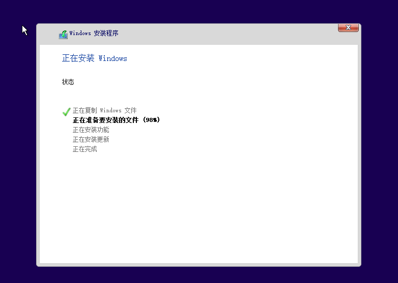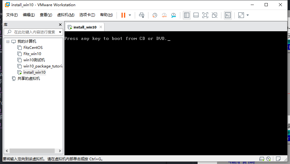 - 千万要注意: 在这个过程中, 虚拟机系统可能会重启几次, 当虚拟机重启再次出现”Press any key to boot from CD or DVD…”时, 千万不要再动键盘让它自己跳过去, 不然的话, 它会再次重新进行win10系统的安装