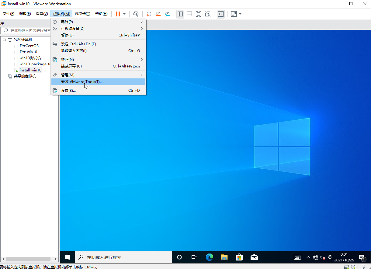 在VMware左上方找到”虚拟机”-“安装VMware tools”, 为当前的虚拟机安装, 如下图所示