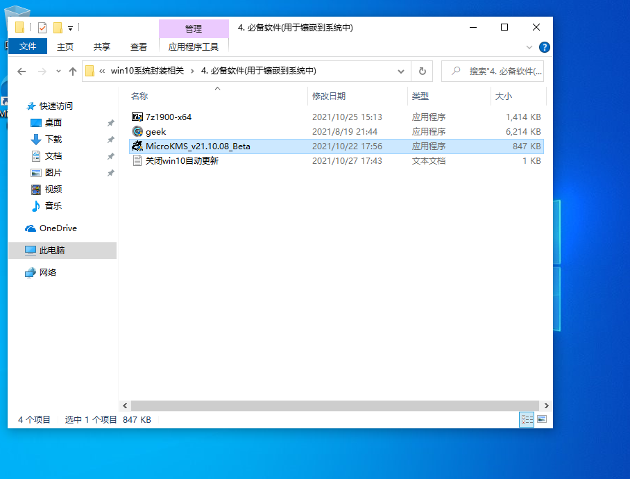 4. 必备软件(用于镶嵌到系统中)–MicroKMS_v21.10.08_Beta.exe–点击第一个激活windows10– 重启虚拟机, 对系统进行激活, 以能够进行后续操作。注意: 此时激活系统只是为了能够做优化, 之后每次安装封装好的系统时仍然都需要重新激活