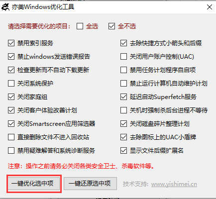 4. 必备软件(用于镶嵌到系统中)–MicroKMS_v21.10.08_Beta.exe– 点击亦是美一键优化工具– 选择与我一样的配置 – 一键优化选中项 – 重启虚拟机