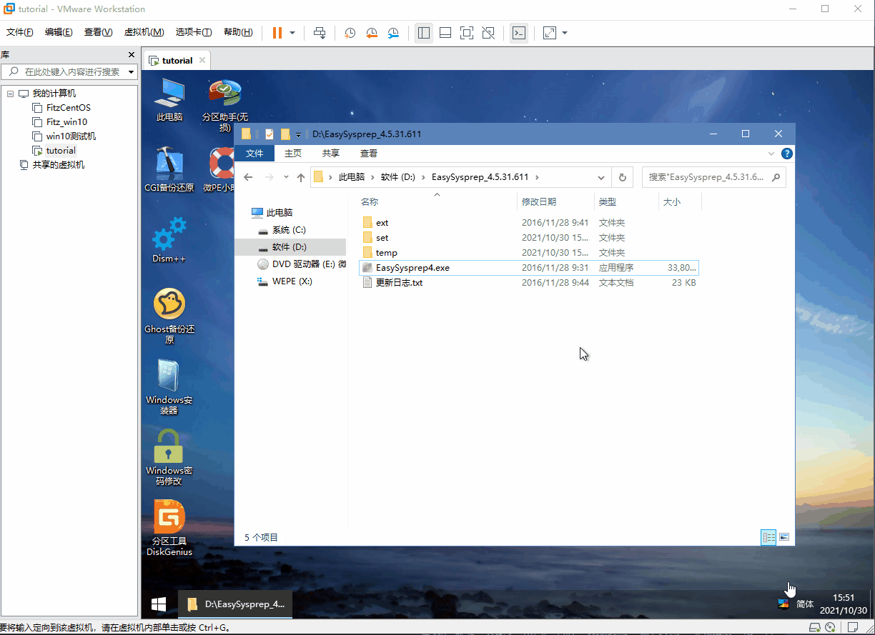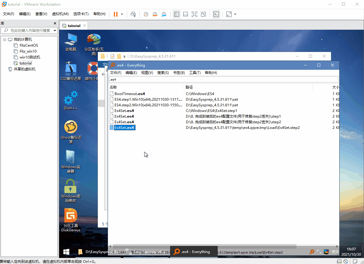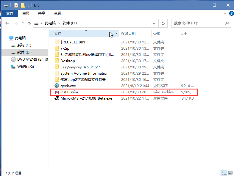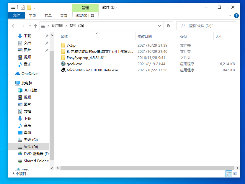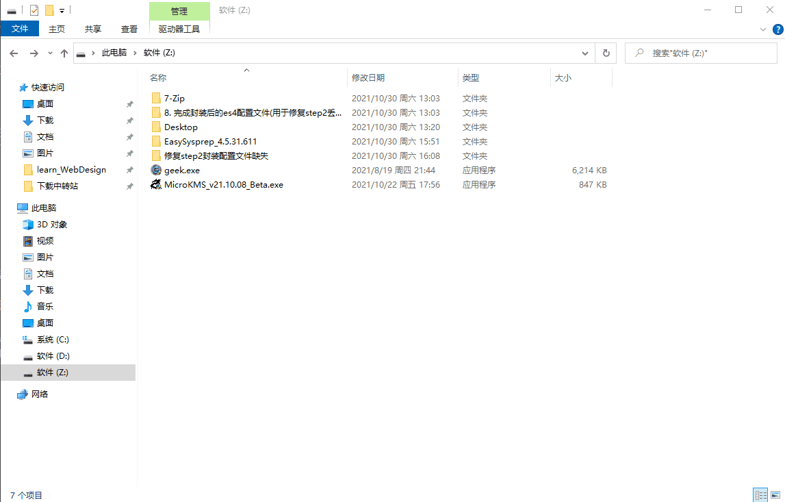 封装工具EasySysprep解压到D盘 – 将8. 完成封装后的es4配置文件(用于修复step2丢失)、4. 必备软件(用于镶嵌到系统中)中的geek , 7zip和 KMS 复制到D盘, 注意: 一定不能放到C盘, 这会影响到封装的系统的纯净性