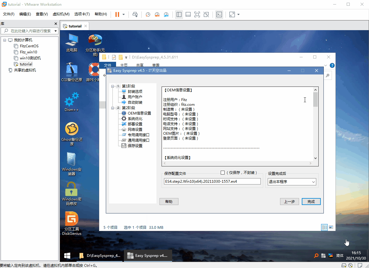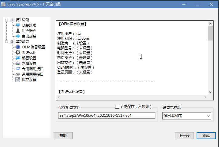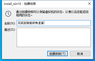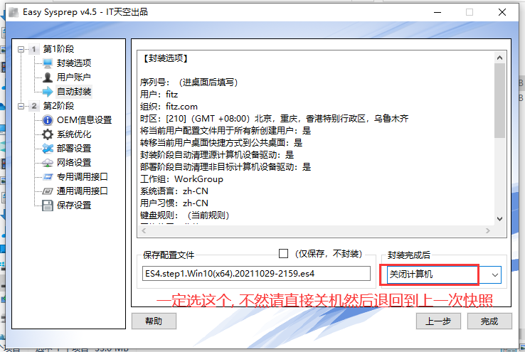 - 一定要选择完成后关闭计算机 – 点击”完成”后等待即可 如果提示封装失败, 请退回到上一次快照, 再重新进行之后的所有操作