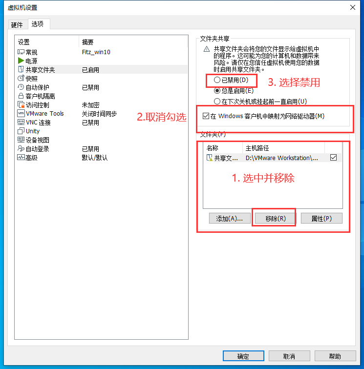 - 去虚拟机设置 – 选项 – 将共享文件夹移除 – 取消勾选”在客户机中映射为网络驱动器” – 禁用”文件夹共享” 注意: 之后再也访问到物理机的资源了, 请仔细检查是否准备好, 要是误操作了, 请重新添加共享文件夹