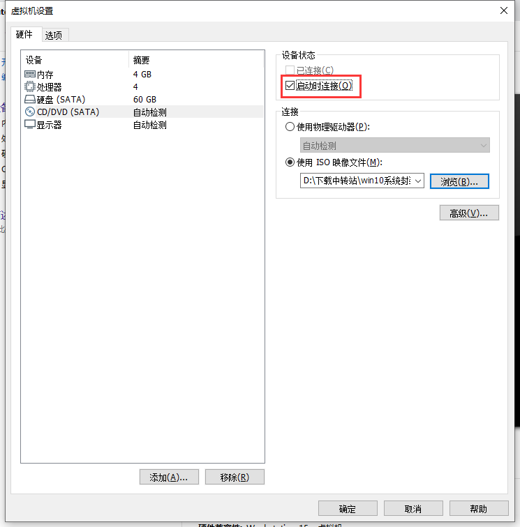 - 去虚拟机设置中先移除旧的CD/DVD(SATA), 然后再添加新的并取消勾选启动时连接