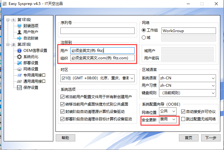 - 填写用户与组织, 禁用安全更新 注意: 要是全英文