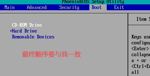 - 切换至”Boot”选项卡,将光驱”CD-ROM Drive”调至最上面(第一启动项), 方法: 用键盘上的上下键选中”CD-ROM Drive”, 然后通过小键盘上的”+”、”-“号进行位置调整