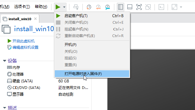 - 接下来返回到虚拟机主界面, 点击图中大绿色三角后面的小三角符号, 在下拉框中选择”打开电源时进入固件”, 这一步是为了进入虚拟机的BIOS, 如图