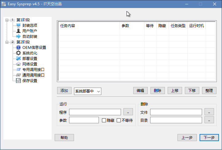 - 这一步用于添加部署任务, 添加的任务可以是: 系统部署前、系统部署中、系统部署后、第一次登陆、首次进入桌面等。 但是一般不在这里执行任务, 所以直接点击”下一步”, ==有需要的可以自行研究、实验==